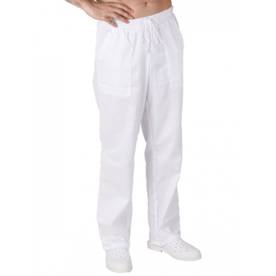 Biele nohavice dámske UNI, celé do gumy: Nohavice sú pohodlného, moderného strihu. Predné vrecká. Nižší pás, ktorý je celý do gumy so šnúrkou. 100% bavlna.
