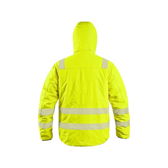 Výstražná bunda s vysokou viditelností, zateplená, odolná proti vodě a větru, kapuce v límci, reflexní pruhy, rukávy a spodní díl zakončeny tmavě modrým materiálem, 4 vnější kapsy a 1 vnitřní kapsa, venkovní kapsa na mobil, možnost utažení v dolní části bundy. Doporučené použití: stavebnictví, silničáři, řidiči, logistika, údržba, popeláři, skladníci, záchranáři, práce v zimě a mokrém prostředí.